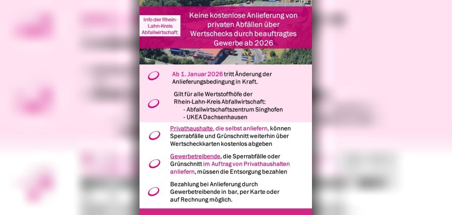 Nr. 363 – 19. Dezember 2025 / Rhein-Lahn-Kreis. Ab dem 1. Januar 2026 ändern sich die Anlieferungsbedingungen auf den Wertstoffhöfen der Rhein-Lahn-Kreis Abfallwirtschaft. Zukünftig werden Abfälle aus Privathaushalten, die durch Gewerbetreibende angeliefert werden, nicht mehr kostenlos gegen Vorlage von Wertscheckkarten angenommen. Gewerbetreibende wie z.B. Entrümplungsunternehmen oder Gartenbauer können Abfälle im Auftrag von Privathaushalten weiter anliefern, müssen aber für die Entsorgung entsprechende Entsorgungsgebühren bezahlen. Die kostenlose Abgabe von zum Beispiel Sperrabfällen oder Grünschnittabfällen über die Wertscheckkarten ist für Privathaushalte weiterhin möglich, solange diese ihre Abfälle selbst auf den Wertstoffhöfen anliefern.