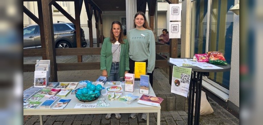 Foto: v.l.n.r.: Samira Meiers (Hygienekontrolleurin) und Alina Zorbach (Kreisgesundheitsmanagerin) mit ihrem Infotisch für das Gesundheitsamt des Rhein-Lahn-Kreises