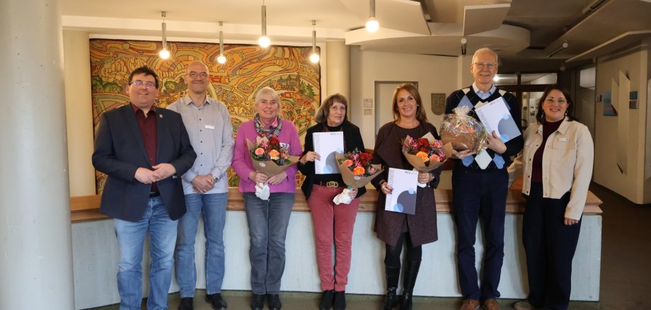 Foto: Landrat Jörg Denninghoff, Markus Noback (Referatsleiter ZA 04), Ingrid Protze, Elisabeth Fleschurz, Catherine Flon-Zausra, Gary Miller, Katharina Kunz (pädagogische Leiterin kvhs) freuen sich gemeinsam über die Ehrungen. Foto: Sabrina Pera/ Kreisverwaltung