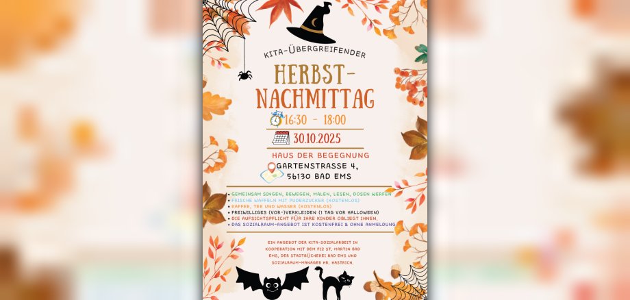 Nr. 280 – Rhein-Lahn-Kreis. Die Kita-Sozialarbeit des Caritasverbandes Westerwald-Rhein-Lahn e.V. lädt Sie herzlich zum nächsten „Kita-übergreifendenden“ Herbstnachmittag“ am 30. Oktober von 16.30 Uhr bis 18 Uhr ins Haus der Begegnung nach Bad Ems ein.