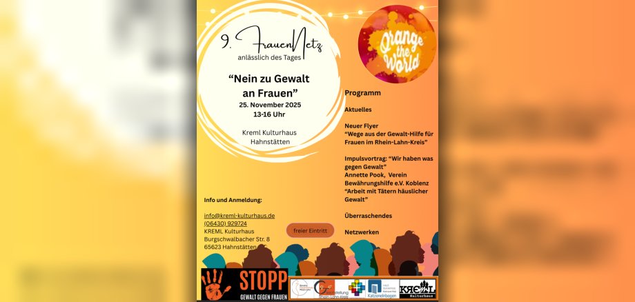 Nr. 311 – Rhein-Lahn-Kreis. Am 25. November 2025, dem Internationalen Tag zur Beseitigung von Gewalt gegen Frauen, lädt das FrauenNetz zusammen mit der Gleichstellungsbeauftragten des Rhein-Lahn-Kreises Frauen und Männer zu einer bedeutenden Veranstaltung ein, um erneut ein starkes Zeichen gegen Gewalt an Frauen zu setzen. Die UN-Kampagne „Orange The World" macht seit 1991 auf Gewalt gegen Frauen aufmerksam. Laut Bundesministerium für Familie, Senioren, Frauen und Jugend, hat jede 3. Frau ab 16 Jahren mindestens einmal in ihrem Leben häusliche, sexualisierte und/oder körperliche Gewalt erfahren. Das sind 12 Millionen Frauen! Gemeinsam mit regionalen Partnern und Fachstellen werden aktuelle Entwicklungen, Unterstützungsangebote und erfolgreiche Maßnahmen im Kreis vorgestellt.