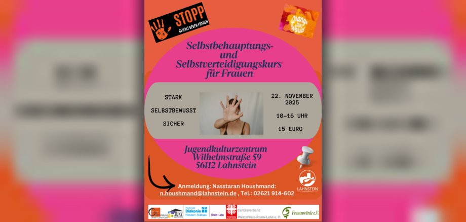 „Gewalt gegen Frauen ist weltweit eine der häufigsten Menschenrechtsverletzungen. Mit diesem Angebot setzen wir ein klares Zeichen gegen Gewalt und für die Stärkung von Frauen!“ sagen die Veranstalterinnen. Kooperationspartner des Workshops sind die Gleichstellungstelle des Rhein-Lahn-Kreises, die Schwangerenberatungstelle der regionalen Diakonie in Hessen und Nassau gGmbH, die Katholische Schwangerschaftsberatung des Caritasverbandes Westerwald-Rhein-Lahn e. V., die Beratungsstelle für Schwangere von Frauenwürde Rhein-Lahn e.V. zusammen mit dem Jugendkulturzentrum Lahnstein.
